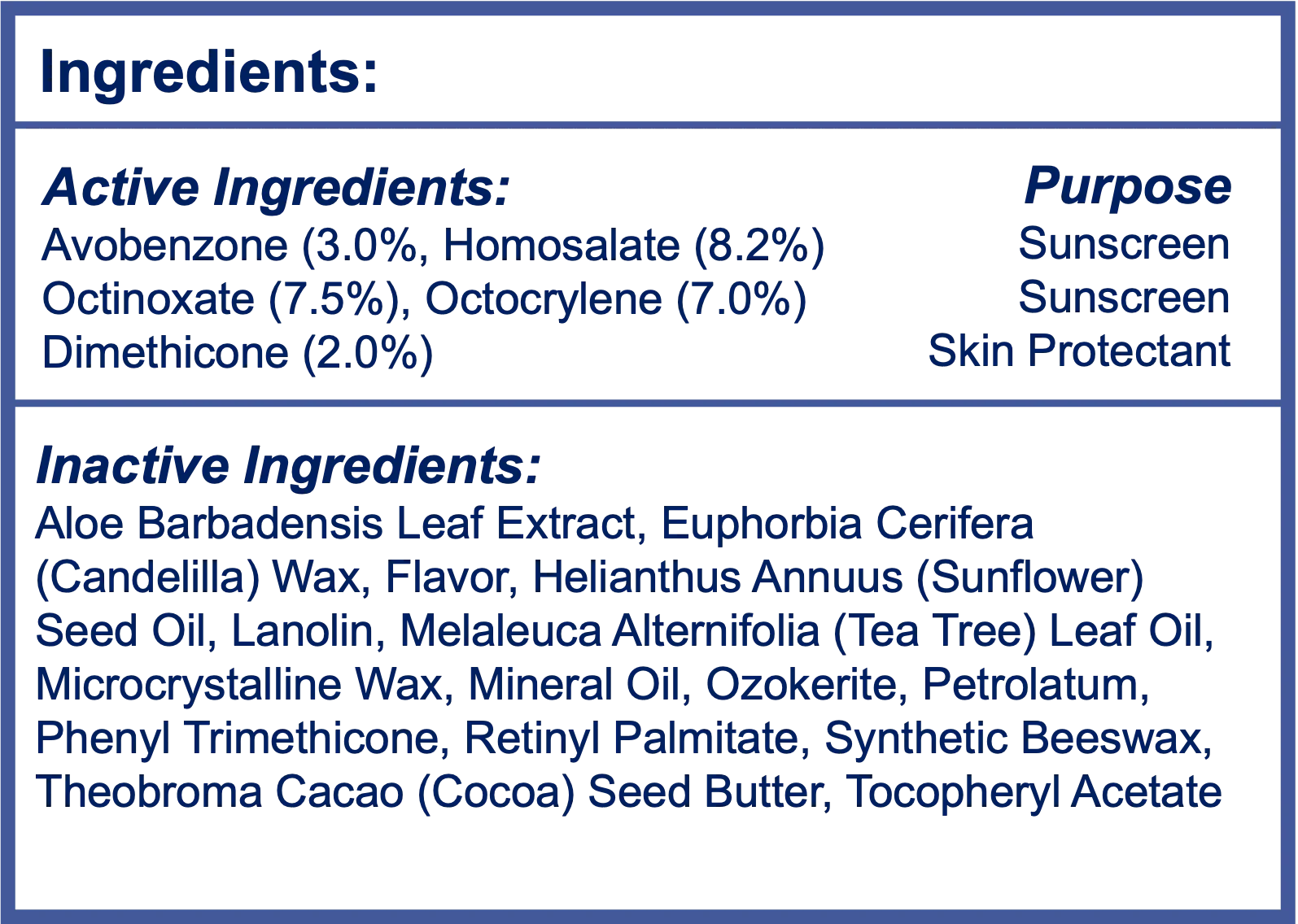 Wirkstoffe: Avobenzon (3 %), Homosalat (8,2 %), Octinoxat (7,5 %), Octocrylen (7 %), Dimethicon (2 %)