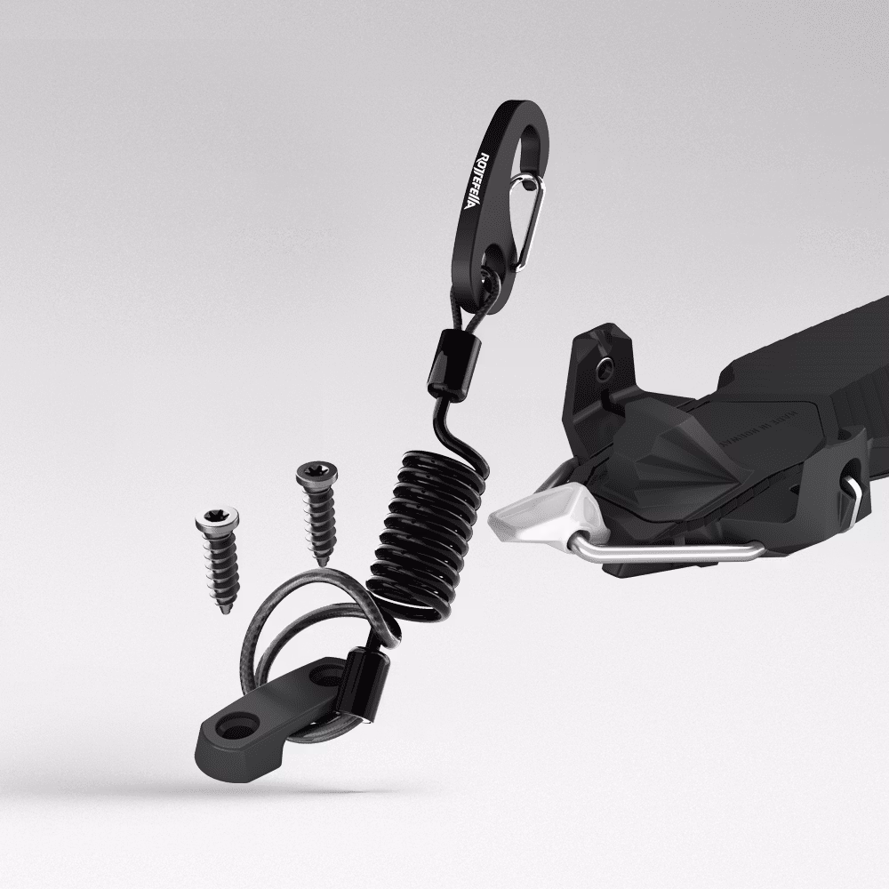 Screw the bracket to the ski and attach the carabiner to the boot.