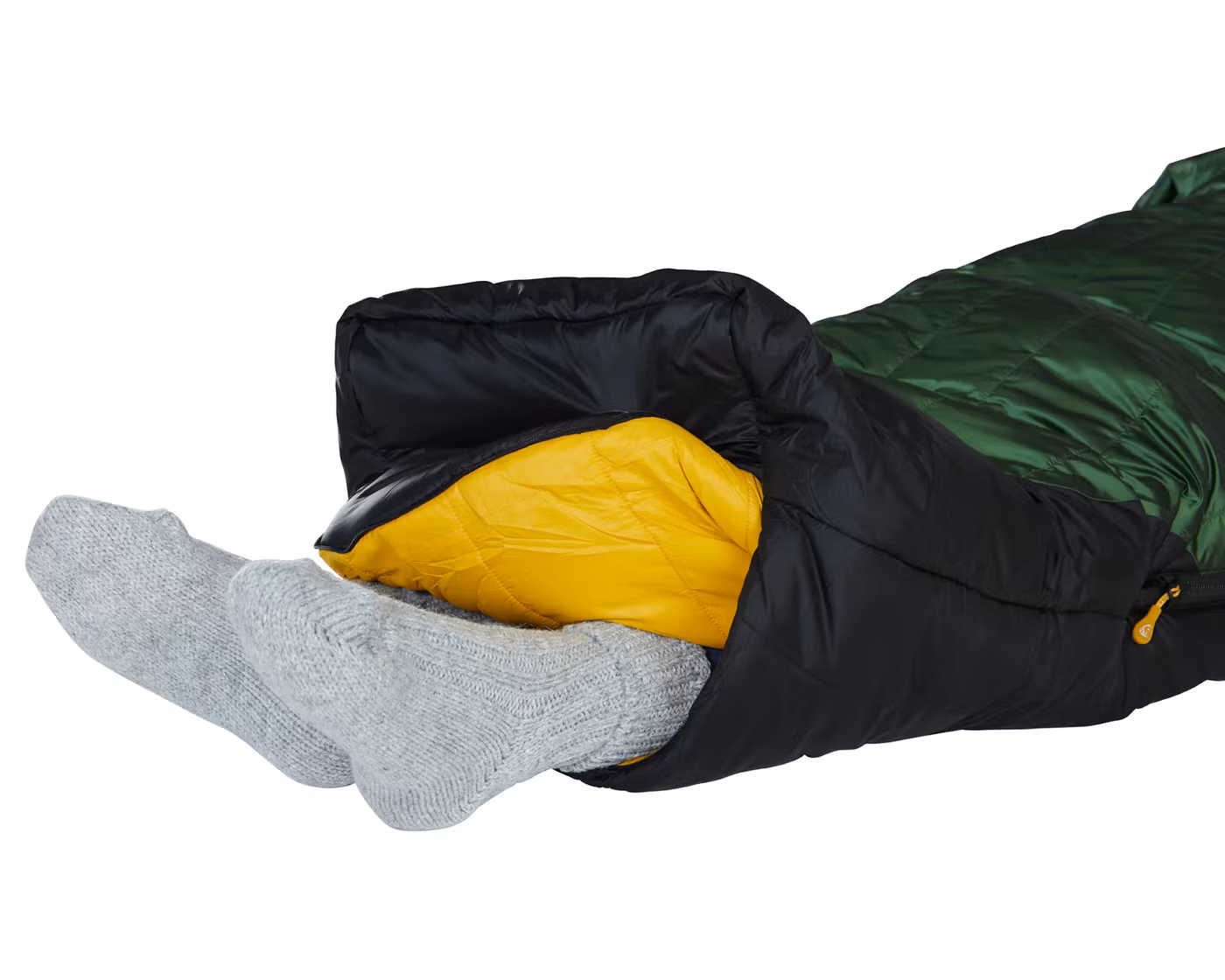 The sleeping bag has an integrated shark-fin foot box that keeps your feet warm, while your head stays warm in the 3D winter hood with hidden drawstring. The footbox offers simple ventilation that lets the feet cool down. Internal thermal collar and chest pocket. The secondary shoulder zipper keeps you warm without compromising your mobility when in the sleeping bag.