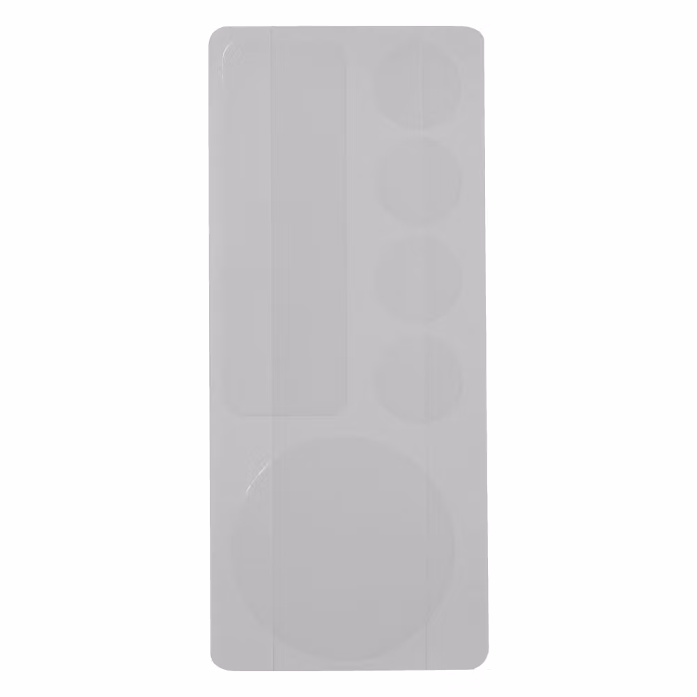 OMM-reparationstejp är en självhäftande, transparent och flexibelt reparationstejp som finns i en serie förskurna former, som kan skäras till ytterligare så att de passar många former av revor och hål.