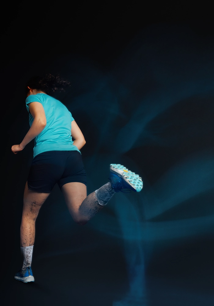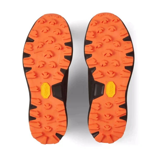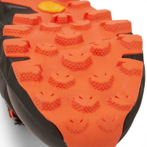 Yttersulan är utrustad med Vibram Megagrip, i kombination med Vibram Litebase och Vibram Traction Lug, vilket ger pålitligt grepp på både vått och torrt underlag samtidigt som vikten hålls nere. 4 mm dobbar ger en optimal balans mellan fäste och löpbarhet på varierande underlag. Under foten sitter ett rock plate‑skydd som skyddar mot stenar och vassa kanter utan att ta bort markkontakten.