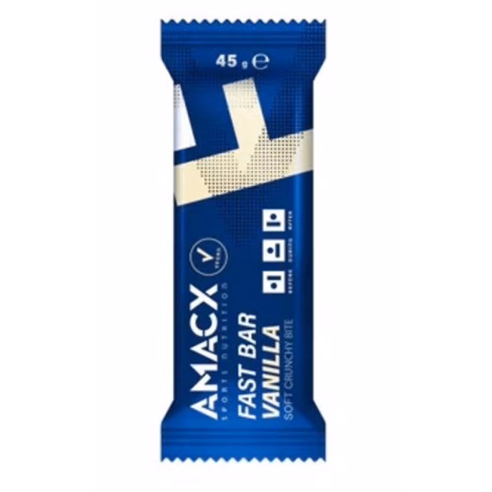 Amacx Fast Bar Chocolate är en källa till olika typer av kolhydrater som ger rätt stöd (kolhydratförhållande 2:1). Tack vare sin mjuka konsistens är denna bar lätt att konsumera, vilket gör den idealisk för användning under sport. Baren består av 40 % mandlar och är naturligt rik på magnesium, kalium och kalcium. Finns i smakerna citron, choklad och vanilj.Användning