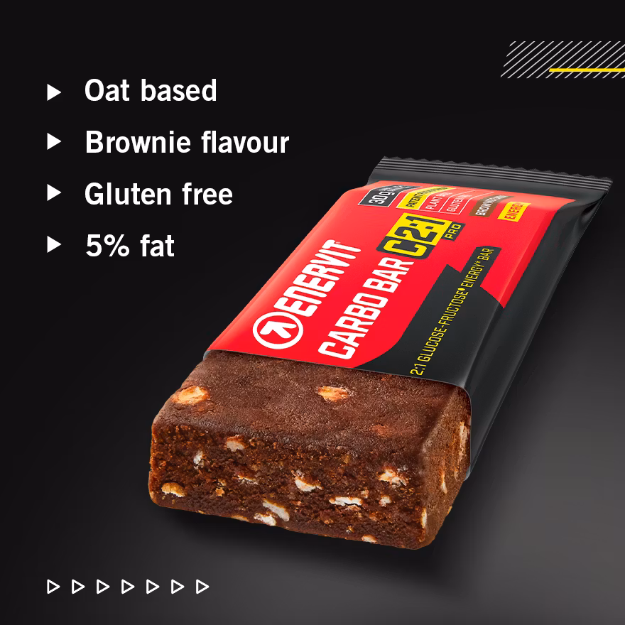 Enervit Carbo Bar C2:1PRO Brownie är den exklusiva havrebaserade energibaren, med glukos och fruktos i förhållandet 2:1.