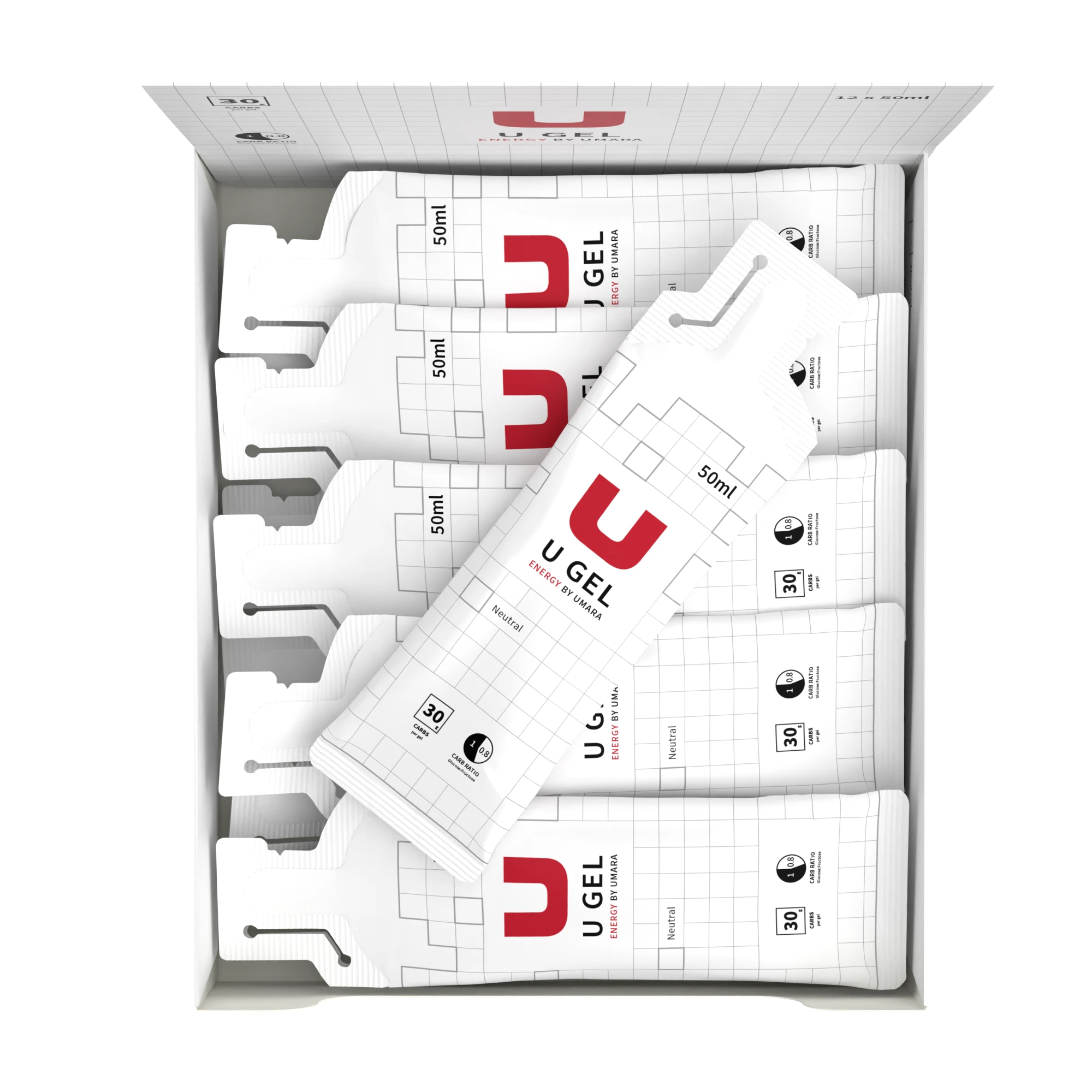 Umara U Gel Neutral 12 Pack innehåller 12 flytande energigeler à 50 ml, där varje gel ger 30 gram kolhydrater och samtliga viktiga elektrolyter för effektiv energi och vätskebalans vid uthållighetsträning och tävling.