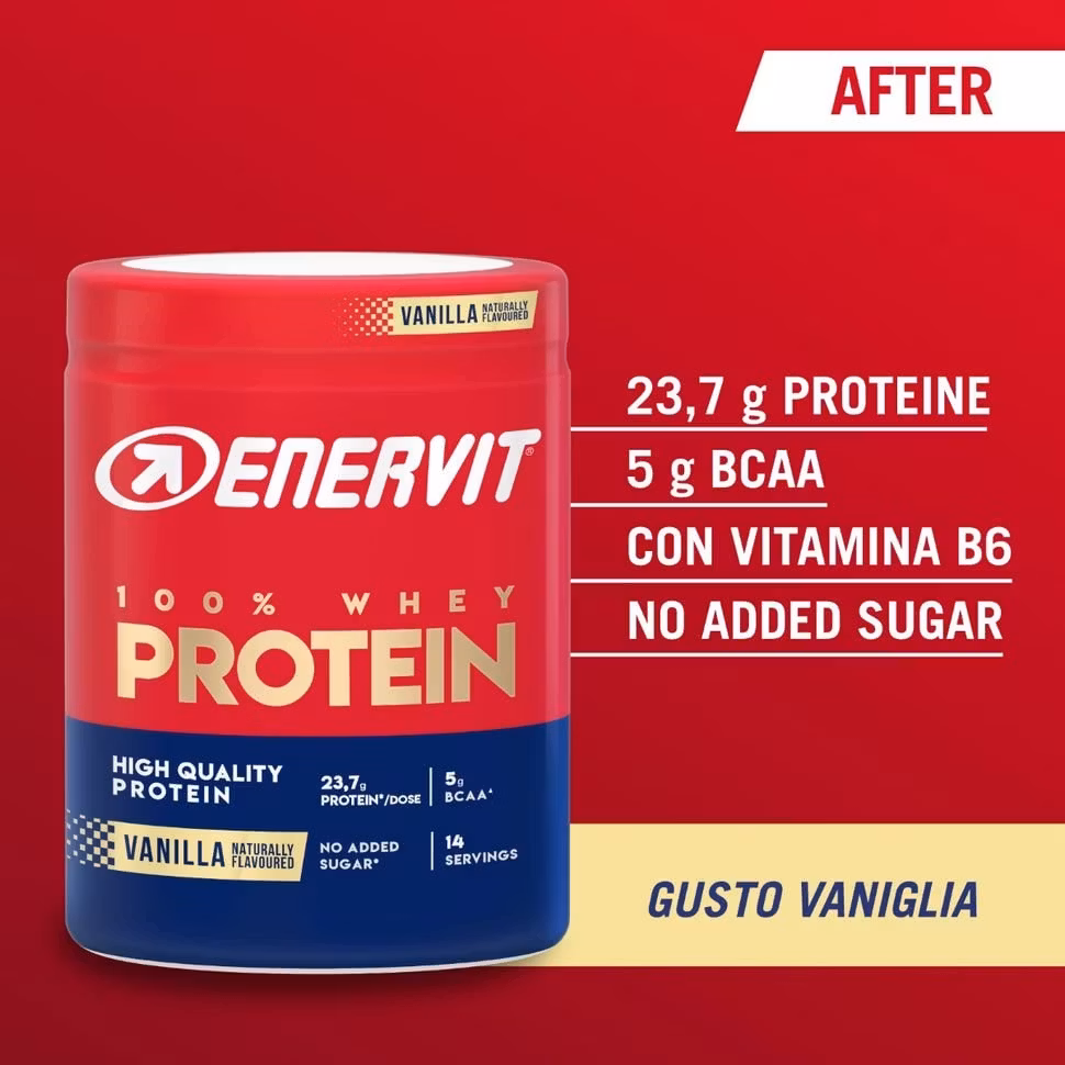 Enervit Sport Protein Whey är vassleproteinkoncentratshaken utformad för dina behov efter träning. Den är snabb och enkel att tillaga, så du kan ta med dig den i slutet av ditt träningspass. Den är till och med idealisk under dagens lopp – din muskelmassa gynnas alltid.