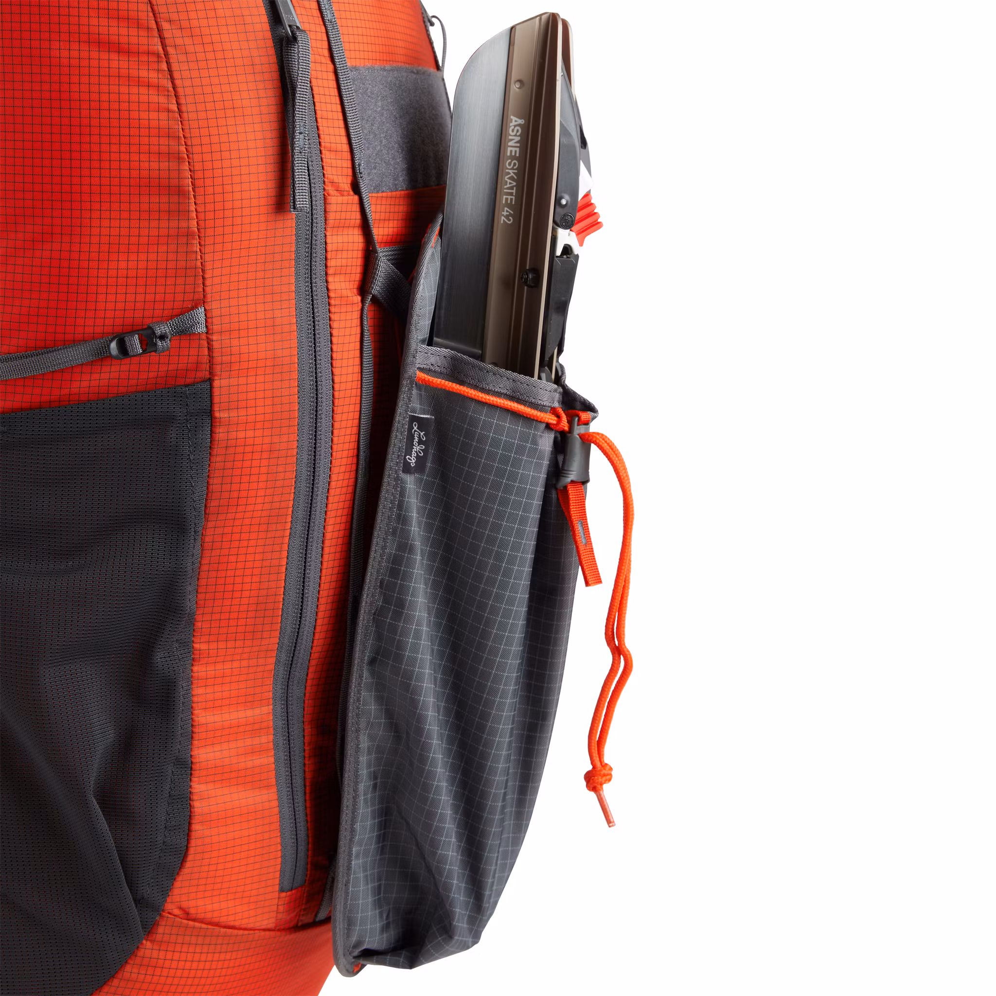 Öppen ovansida av fickan för användning med låg friktion med en räddningslina monterad i ryggsäckens sidopanel, men fickans ovansida kan också dras åt för att hålla ett par skridskor eller en flaska på plats under transport.