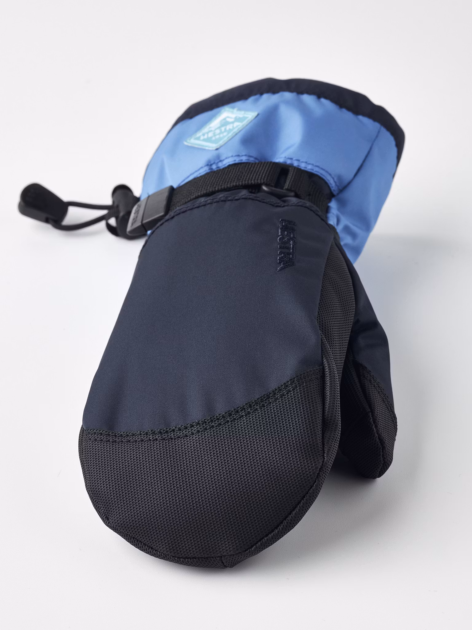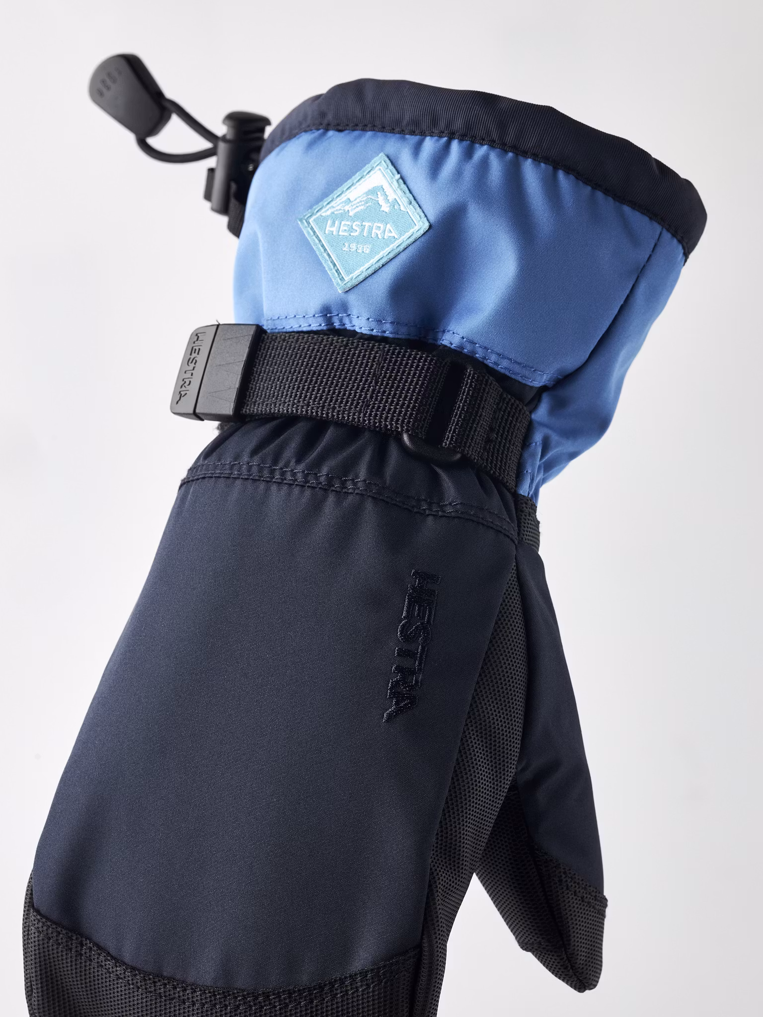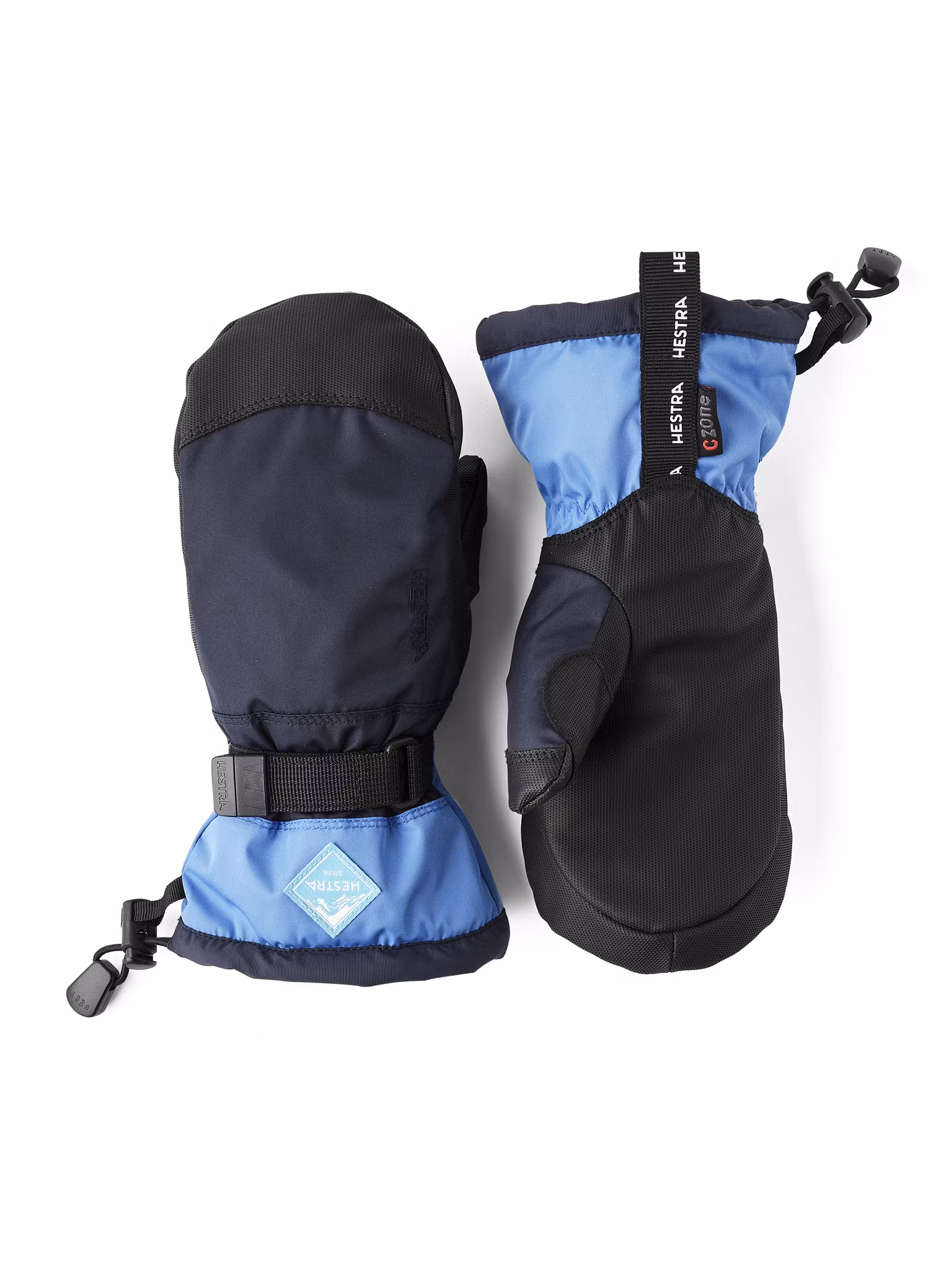 Varm och skön tumhandske för aktiva barn. En av Hestras mest populära juniormodeller och perfekt för skidåkning, lek och uteliv i kallt vinterväder. Sydd i tålig polyester med vattentätt och ventilerande CZone-membran och längre krage som håller snön på utsidan. Fingertoppar och handflata är förstärkta med PU-belagd syntetväv för extra slitstyrka och bra grepp. Insidan är i fleece och handsken har värmande syntetfyllning i polyester. Finns även i 3- och 5-fingermodell.
