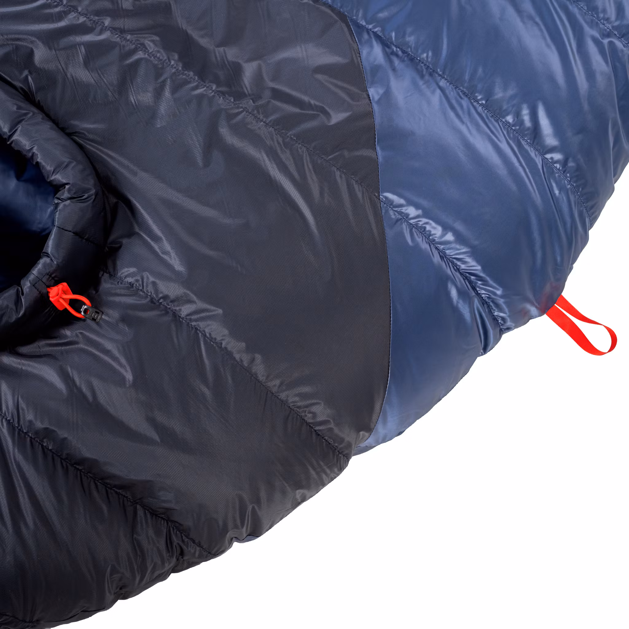 YKK-dragkedjan rör sig enkelt och hakar inte i sig, medan det inre dragröret skyddar mot värmeförlust. Inuti finns en ficka för dina nödvändigheter – telefon, pannlampa eller dokument – så att du inte behöver fumla runt i mörkret. Utanför finns torköglor som gör att du enkelt kan hänga upp säcken för att vädra ut den innan du ger dig ut på vandringen igen.