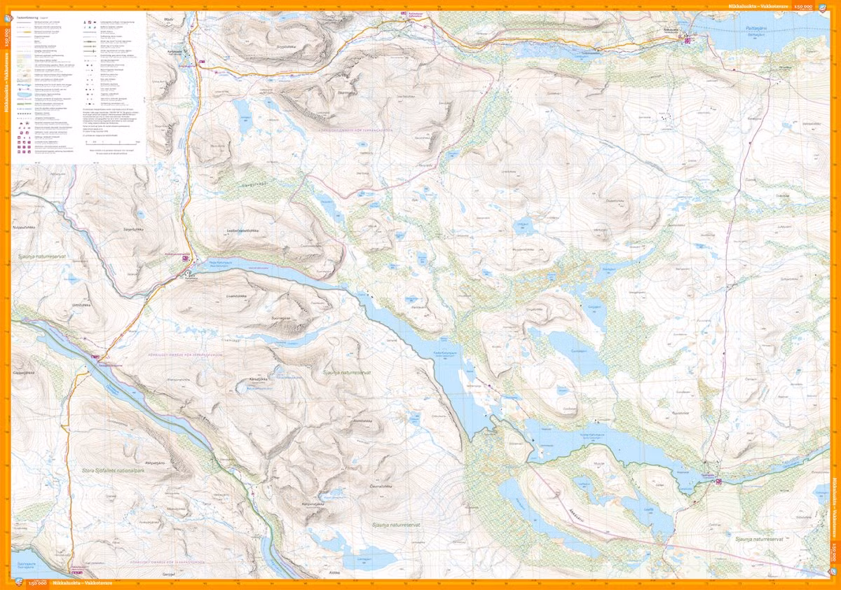 Den här kartan täcker Kungsledens sträckning mellan Sälkastugorna och Vakkotavare men även leden till Nikkaluokta via Kebnekaise fjällstation samt Nordkalottleden via Hukejaurestugan till Sitasjaure och Ritsem.