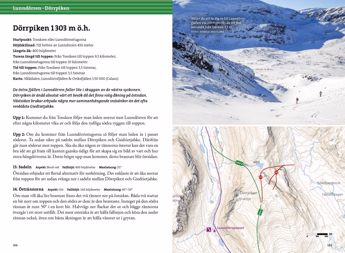 Varje åk i boken beskrivs med fakta om fallhöjd, aspekt och maxlutning. En viktig del av boken är ”den nya generationens fjällkarta” där laserdata skapat möjligheter att illustrera fjällen med en större detaljrikedom än någonsin tidigare. Många åk är även inritade på fotografier för att ytterligare underlätta att hitta rätt åklinje.