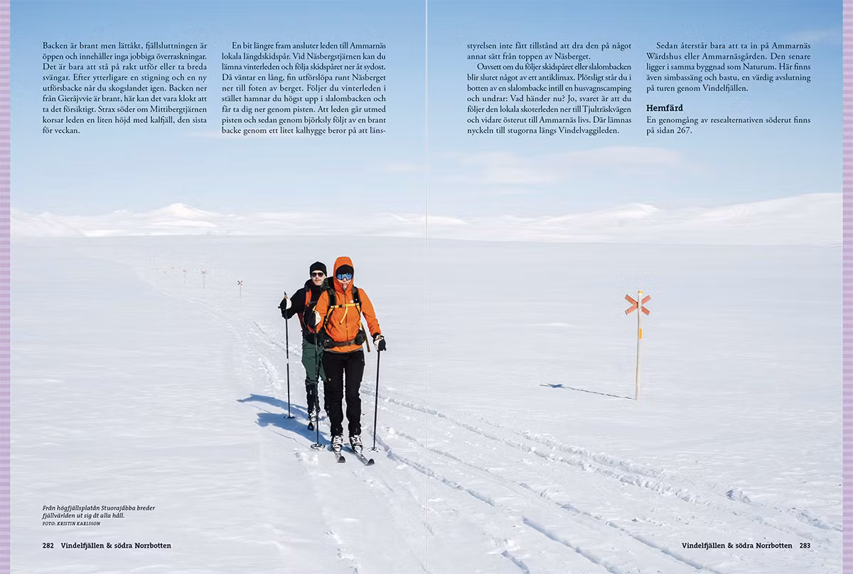Boken består av två delar: först en omfattande handledning med all kunskap du behöver för att planera och genomföra en vintertur mellan fjällstugor, därefter en guide till våra finaste fjällområden med femton färdiga turförslag som passar både nybörjare och erfarna skidåkare.