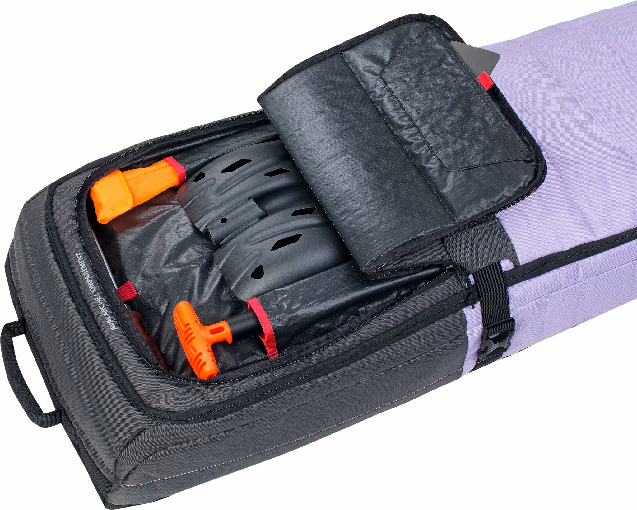 En väska med hjul och handtag för transport av skidor och snowboard. Väskan har separat fack för lavinutrustning samt lättåtkomliga fickor för utrustning. Kan vikas ihop för förvaring.