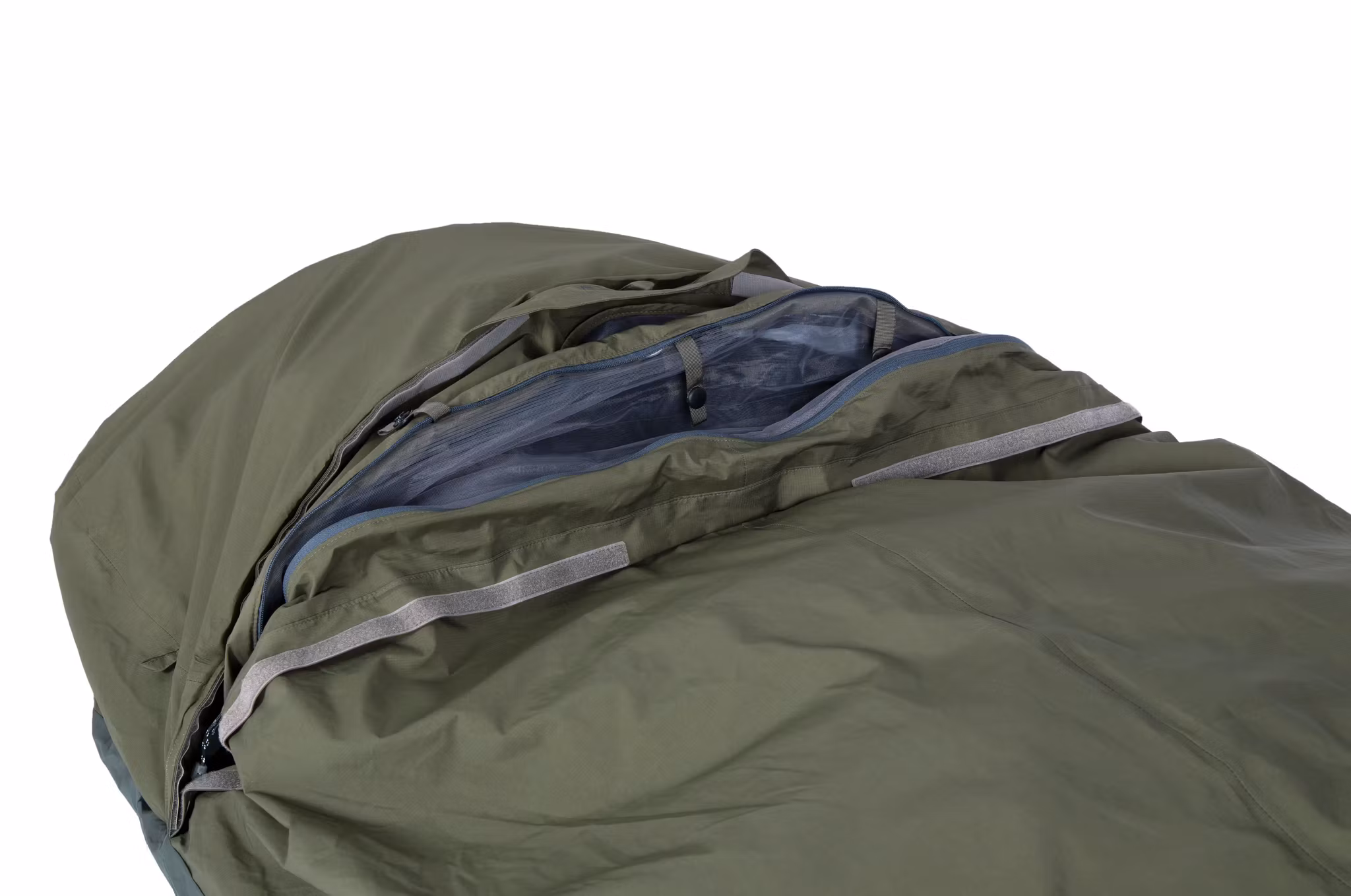 Tack vare den breda 3D-fotdelen finns det också plats för en voluminös sovsäck. Både på huvan och fotdelen finns tre upphängningsöglor, med vilka bivyväskan kan hängas upp