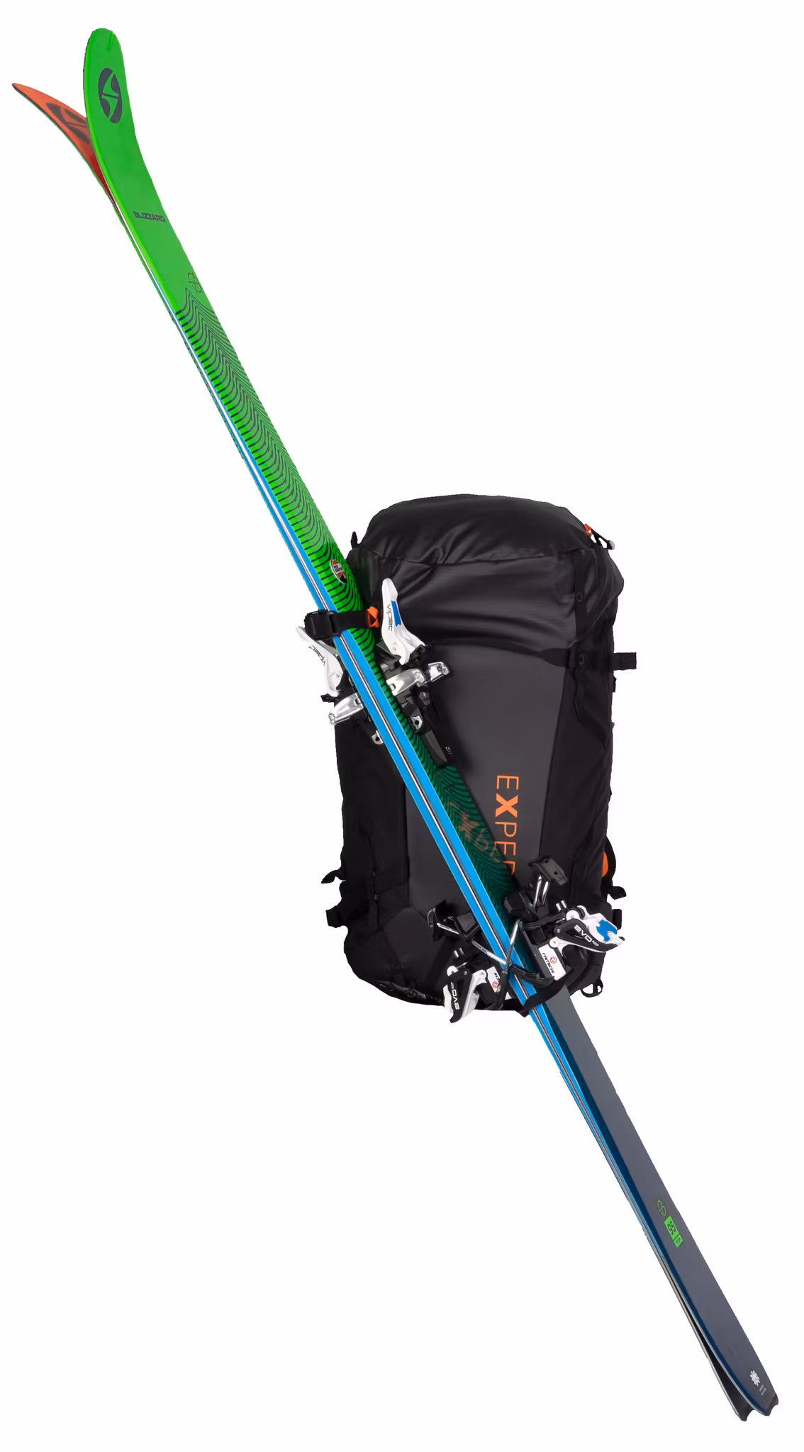 Skidor och splitboards kan enkelt spännas fast på tre olika sätt. De medföljande vävbanden med spännen gör det också möjligt att fästa snowboards och snöskor vertikalt på framsidan av ryggsäcken. Alla fickor och fack är lättåtkomliga även med handskar på. Utrustningsöglorna kan tas bort när de inte används. De två isyxfästena kan placeras fritt.