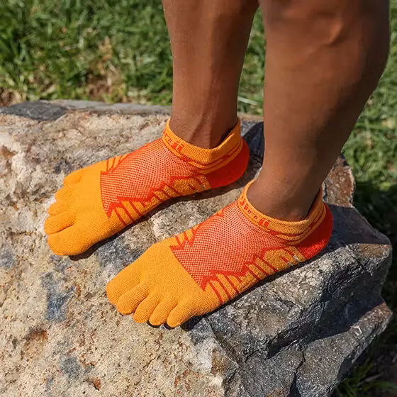 Strumpan är stoppad med extra frotté under hela foten och runt tårna för att mildra effekten på fötterna vid tuffa pass. Ijnjinji's unika fem-tå design gör att varje tå är avskild, vilket eliminerar all hudkontakt mellan tårna och förhindrar blåsor och skavsår. Ultra Run No-Show når strax under anklarna och har en hälflik för att motverka skav.