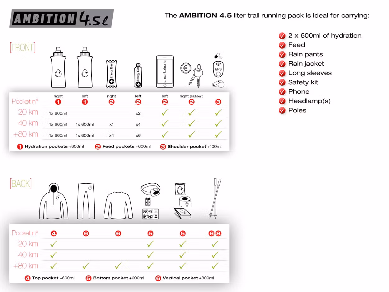 – 1 x 700 ml nedre horisontella ficka. Central åtkomst till säkerhetsutrustning, pannlampa(or), handskar, armvärmare…