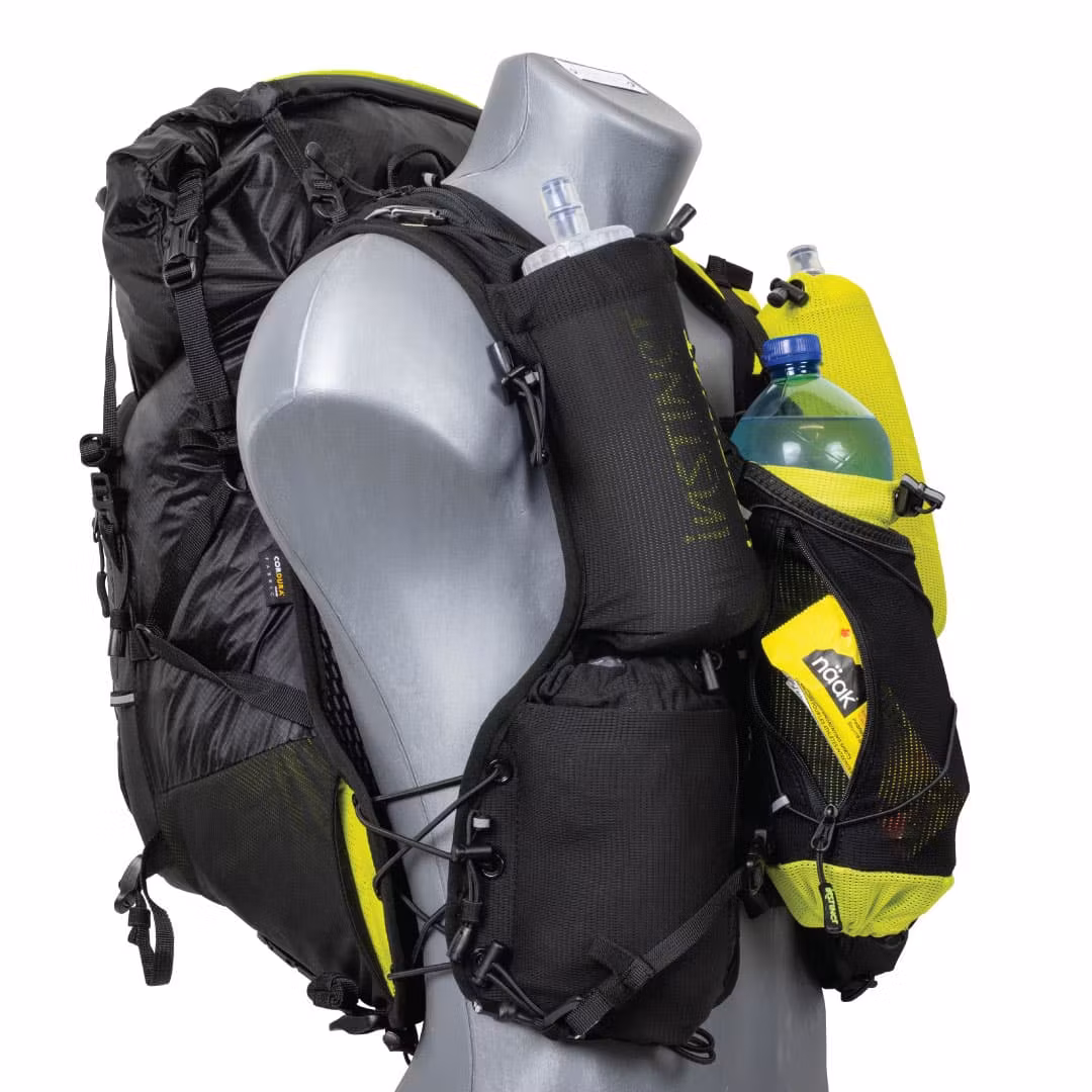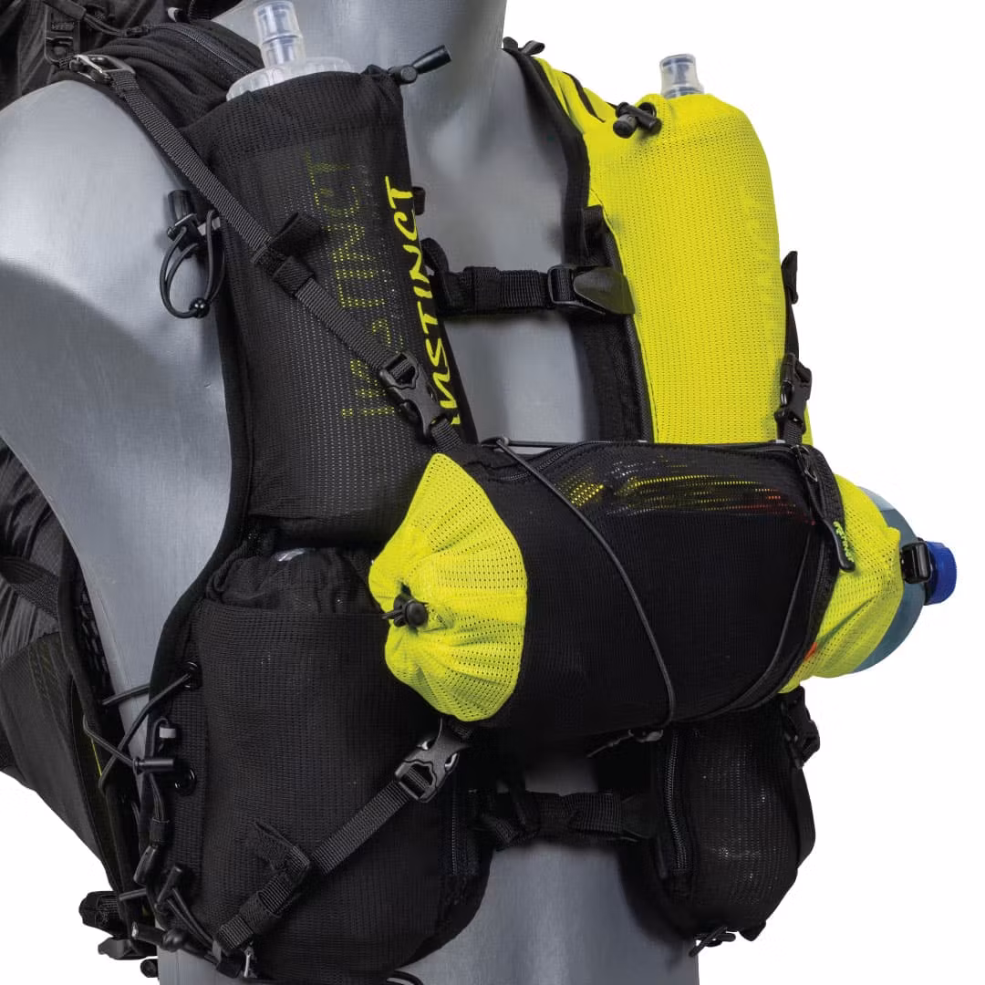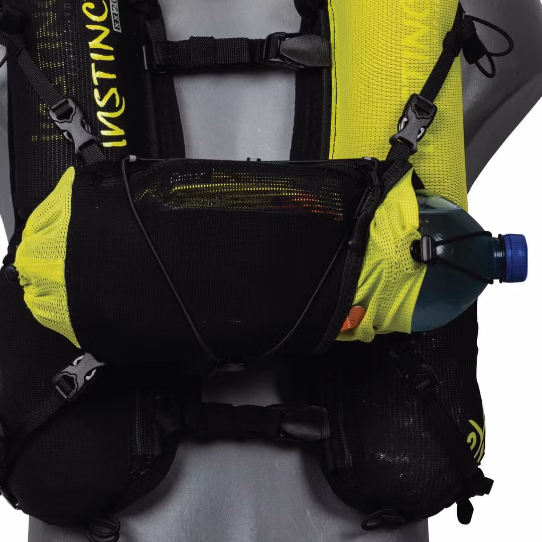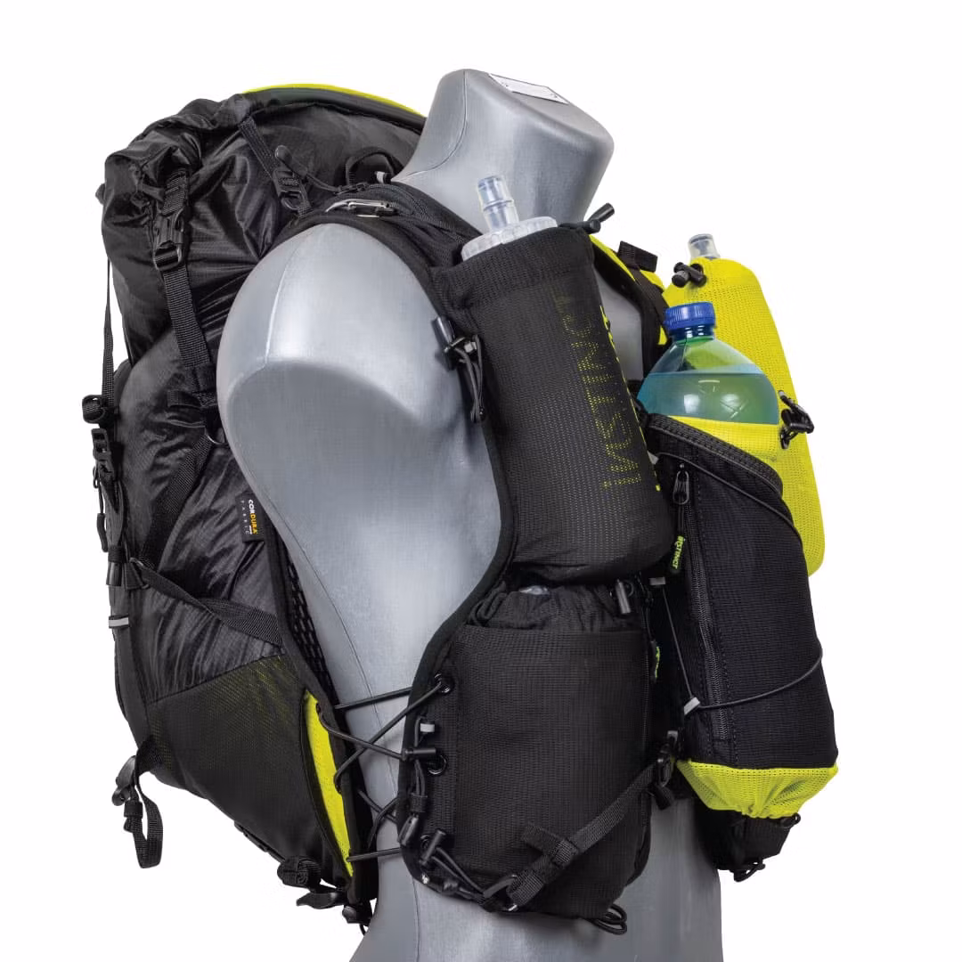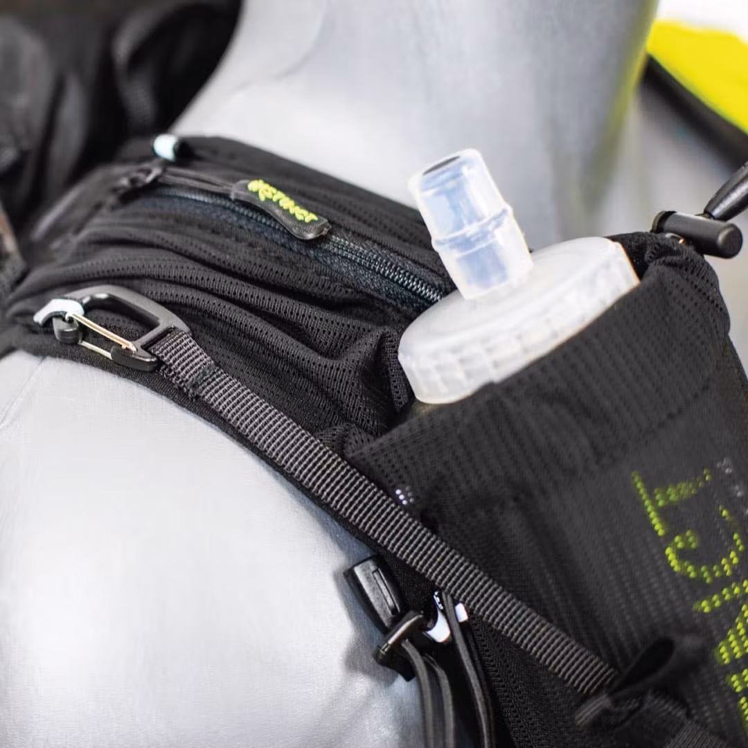 När den bärs vertikalt får du snabbare åtkomst till ALLA framfickor. Genom att placera den extra vattenflaskan mellan axelremmarna kan du maximera mängden vatten som bärs samt förbättra armrörelsefriheten vid full ansträngning.