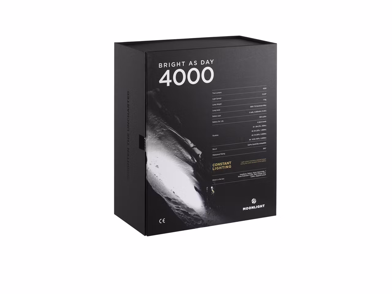 Moonlights otvivelaktigt kraftfullaste pannlampa med åtta lysdioder som mäts till 4000 lumen. Denna best kommer att förvandla natt till dag och ge dig all den sikt du behöver för alla extrema äventyr i alla förhållanden. Medan du är i rörelse kyler Moonlights bladdesign ner lamphuvudet så att lysdioden fortsätter att leverera sin fulla effekt. Bright As Day 4000 är den perfekta följeslagaren för att göra din nästa cykel- eller skidtur lika ljus som dagen.
