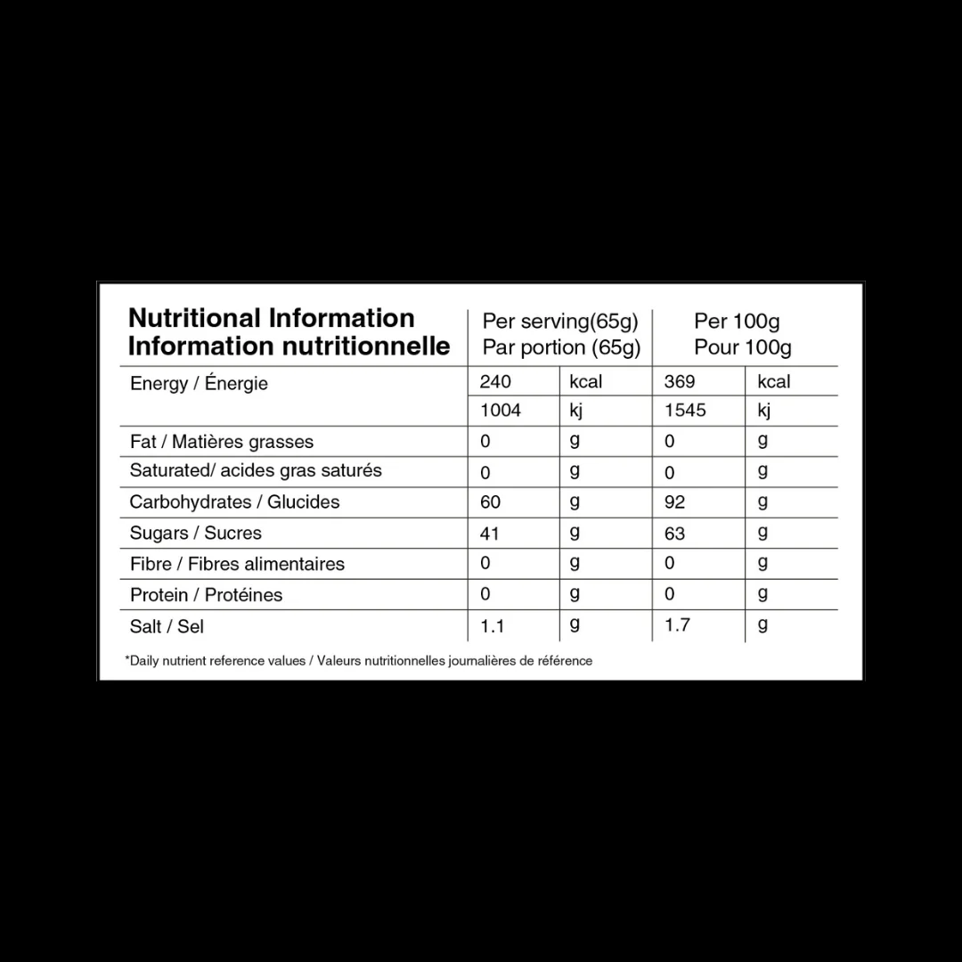 Drycken bygger på ett 2:1‑förhållande mellan glukos och fruktos, vilket möjliggör snabb absorption och högt kolhydratupptag även vid hög intensitet. Med 500 mg natrium per portion hjälper den till att ersätta det viktigaste mineralet som förloras via svett, särskilt under varma förhållanden eller långa pass.