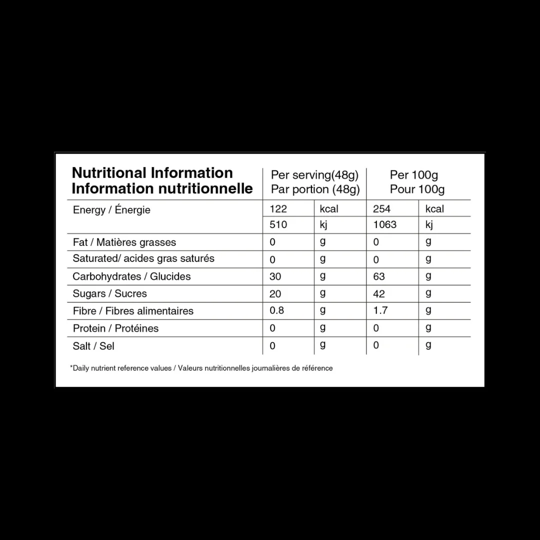 Gelen är formulerad med ett 2:1‑förhållande mellan glukos och fruktos, vilket möjliggör snabb absorption och jämn energileverans även vid hög intensitet. Den är utvecklad för långvarig frisättning för att minska risken för sockercrash under långa pass.