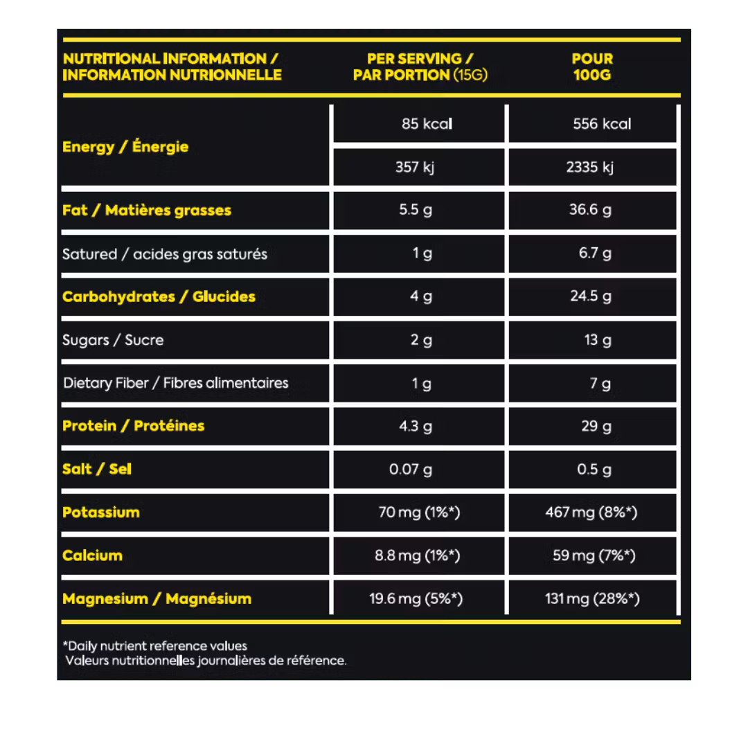 Ingredienser: Torkade rostade jordnötter (63,5 %), ärtprotein (14 %), rörsocker (11 %), rapsolja (5 %), linfröolja (4 %), kokosolja med medellånga triglycerider (2 %), rosa Himalayasalt.