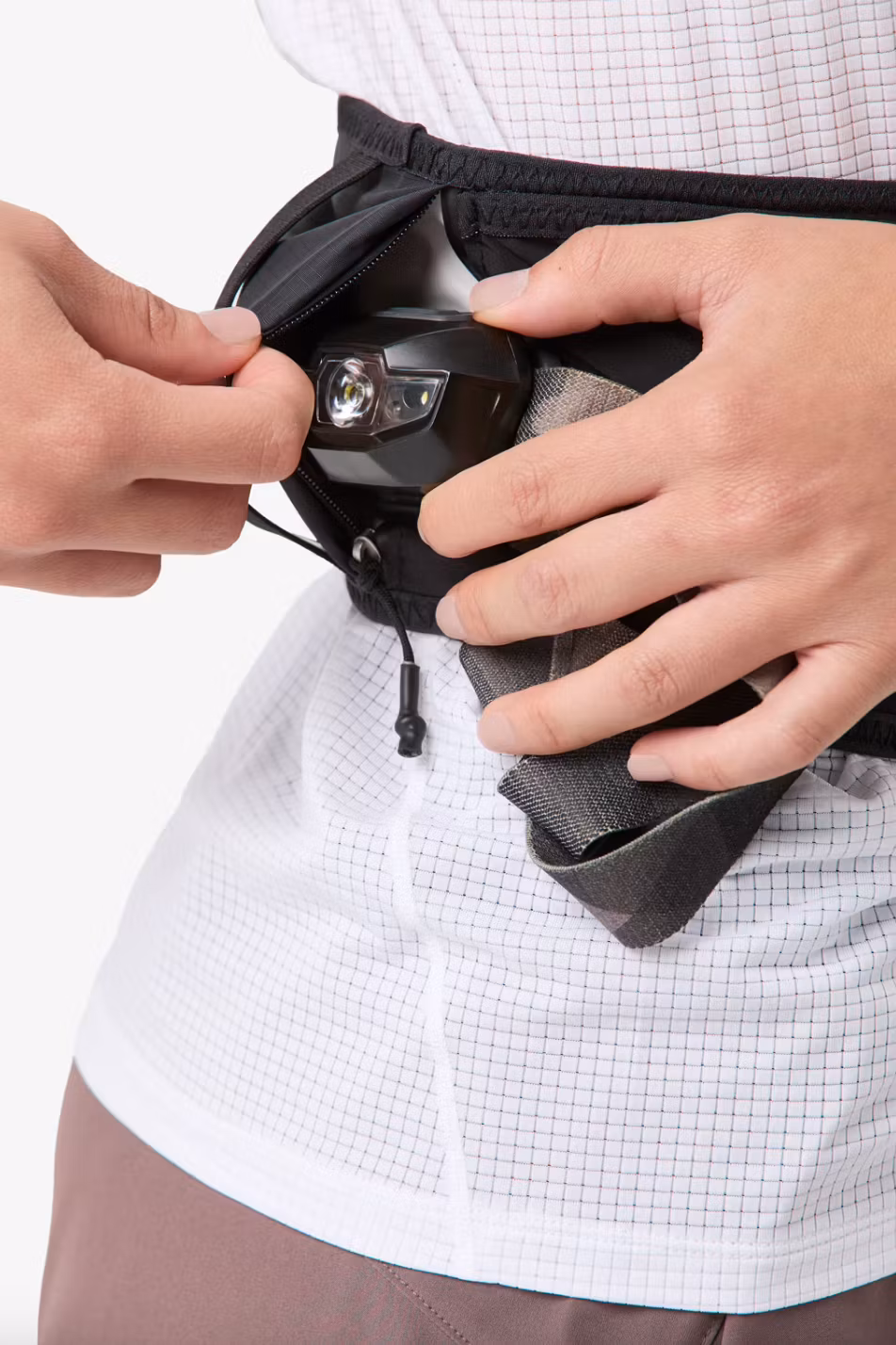 Ergonomisk och funktionell: Konstruerad för rörelse, erbjuder den en åtsittande passform som följer med dig och förhindrar distraktioner när du navigerar på ojämna stigar. Den har stavöglor baktill för att hålla löparstavar vid behov och två elastiska fästen framtill för att fästa dina tävlingsbyxor på löparbältet.