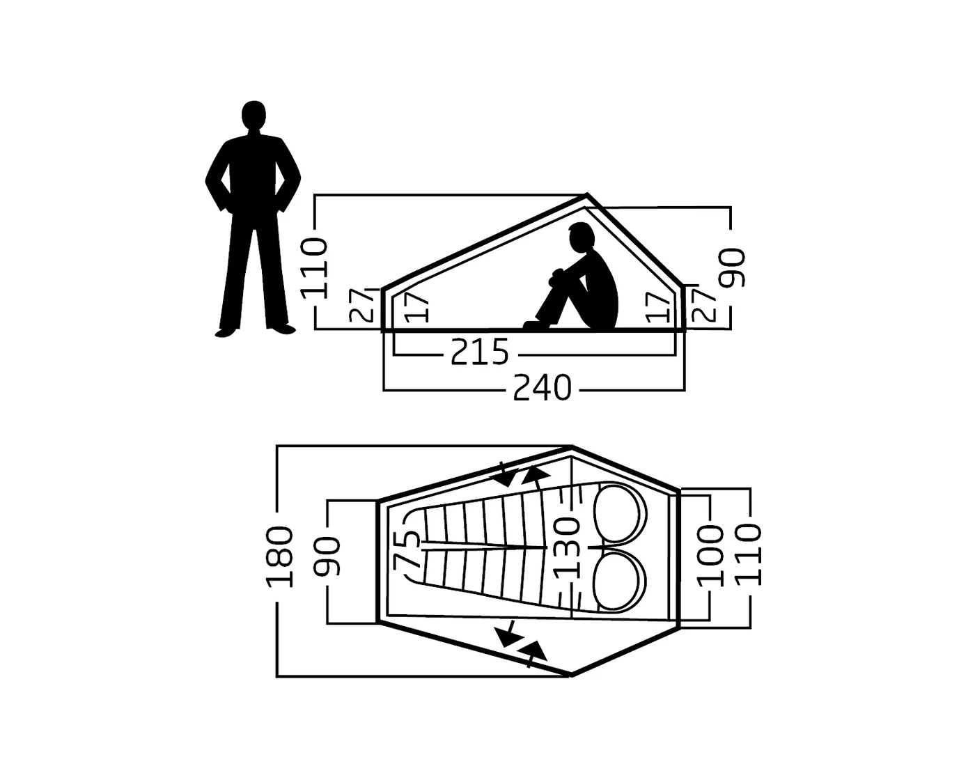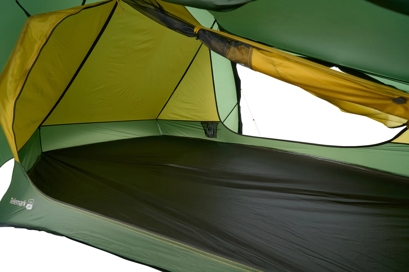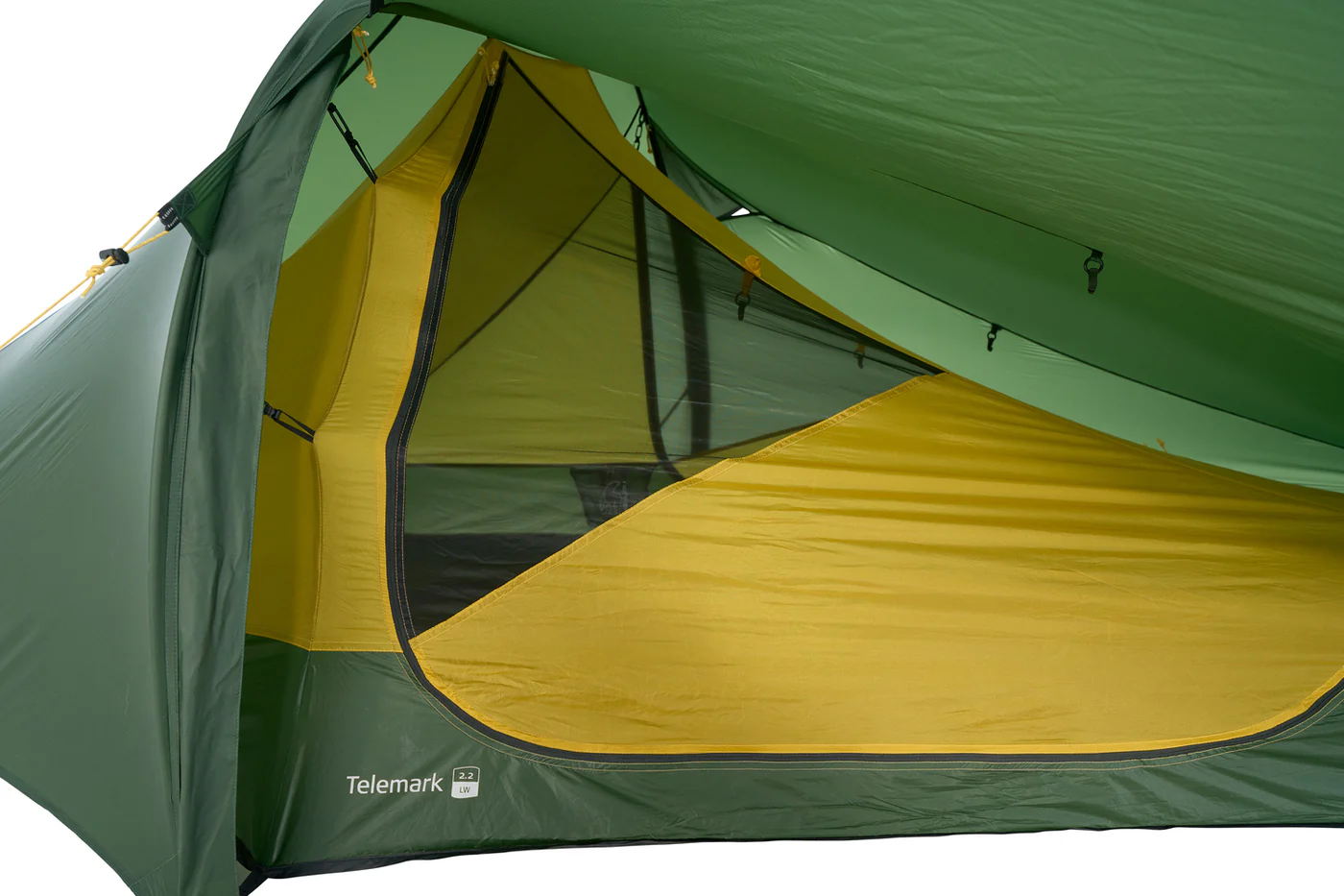 Telemark 2.2 LW (2.0) har en uning tunnellösning med dubbel ingång, vilket ger enkel in‑ och utgång för båda personer och effektiv genomströmning av luft. Den justerbara innertältsbredden gör det möjligt att prioritera sovyta eller absidutrymme beroende på behov, och ytterdörrarna kan omvandlas till skyddande tak/apsis med den medföljande extralinan.