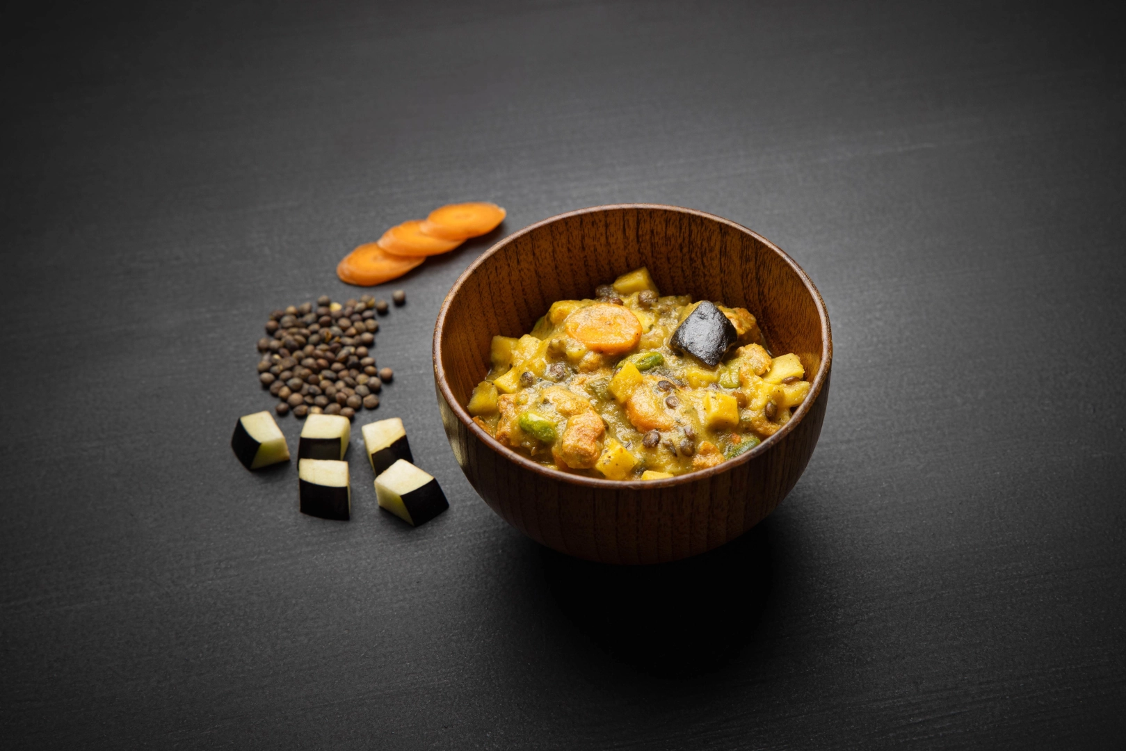 Potatis (28%), linser (15%), ärtprotein (58% ärtproteinkoncentrat (gula ärtor), rapsolja, kryddor, socker, salt, tomatpulver, örter, naturlig arom, jästextrakt, citronsaftkoncentrat, citronsyra (E330)), kokosmjölk, morot (7,5%), rapsolja, grädde (mjölk), edamame (soja), aubergine (3,8%), majsstärkelse, sojasås (soja, salt, vinäger), vitlök, ingefära, vegetabilisk buljong (salt, glukossirap, arom, lök, modifierad stärkelse, maltodextrin, rapsolja, grönsakskoncentrat, smaksättning, socker, vinägerextrakt), smaksättning, garam masala (0,2%), antioxidant (rosmarinextrakt, askorbinsyra).
