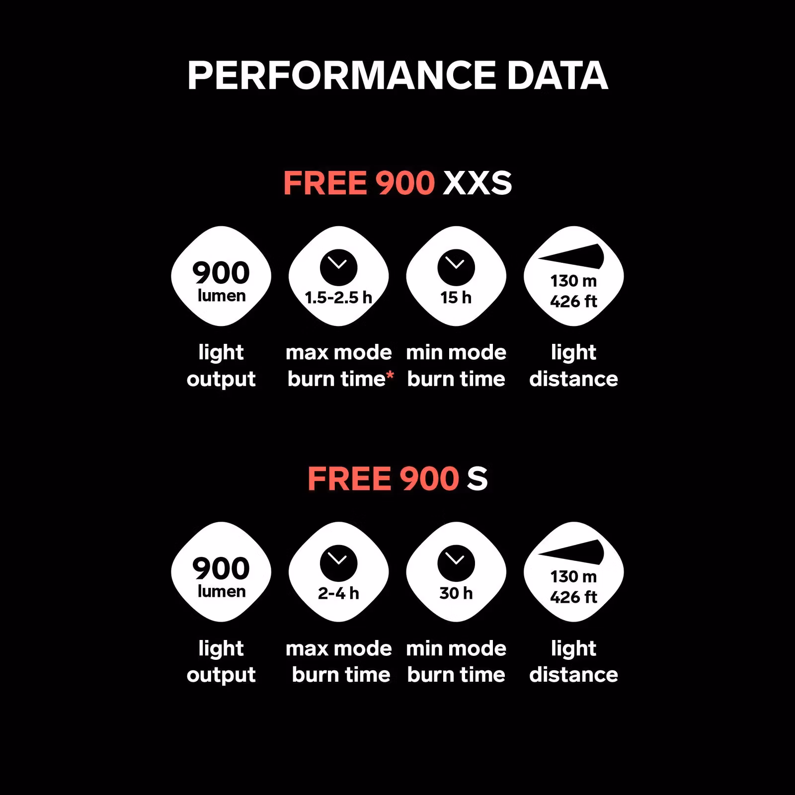 Med 900 lumen, ett platt lättviktsbatteri och ett ultralätt, minimalistiskt och justerbart pannband erbjuder modulära Free 900 XXS en lätt och bekväm passform optimerad för löpning. Det 96 g lätta batteriet kan enkelt förvaras i fickan eller löparvästen och ansluts till pannbandet med en integrerad textilkabel, vilket minskar vikten på huvudet.