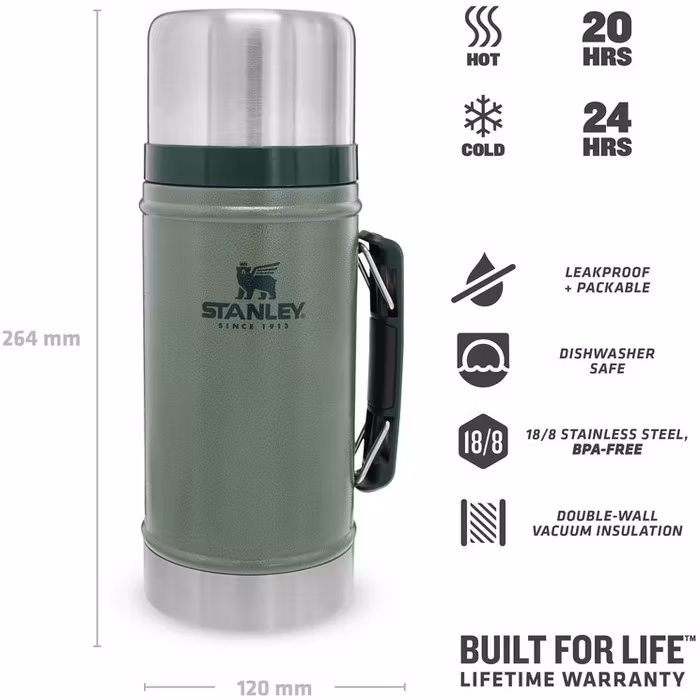 Rejäl klassisk Stanley 0,94 liters mattermos. Håll din kycklingsoppa varm, din gazpacho kall och njut av allt in i sista tuggan.