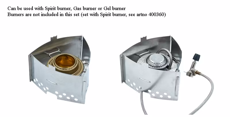 Ställning i tre delar och hållare för brännare i rostfritt stål och fodral. Kan användas med spritbrännaren, gasolbrännaren eller gelébrännaren (brännare ingår ej).